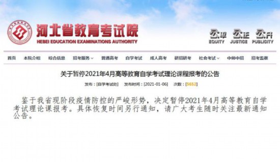 荔枝新闻讯 河北省教育考试院网站6日刊发关于暂停2021年4月高等教育自学考试理论课程报考的公告。公告指出,鉴于河北省现阶段疫情防控的严峻形势,决定暂停2021年4月高等教育自学考试理论课报考。具体恢复时间另行通知。