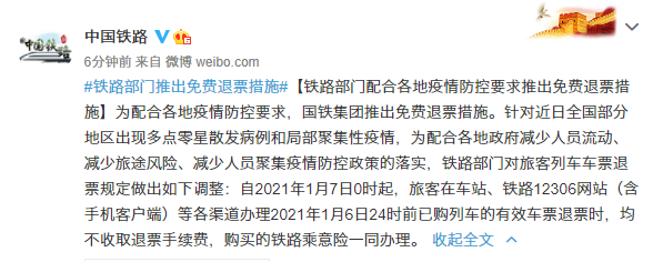 荔枝新闻讯 为配合各地疫情防控要求,国铁集团推出免费退票措施。针对近日全国部分地区出现多点零星散发病例和局部聚集性疫情,为配合各地政府减少人员流动、减少旅途风险、减少人员聚集疫情防控政策的落实,铁路部门对旅客列车车票退票规定做出如下调整:自2021年1月7日0时起,旅客在车站、铁路12306网站(含手机客户端)等各渠道办理2021年1月6日24时前已购列车的有效车票退票时,均不收取退票手续费,购买的铁路乘意险一同办理。