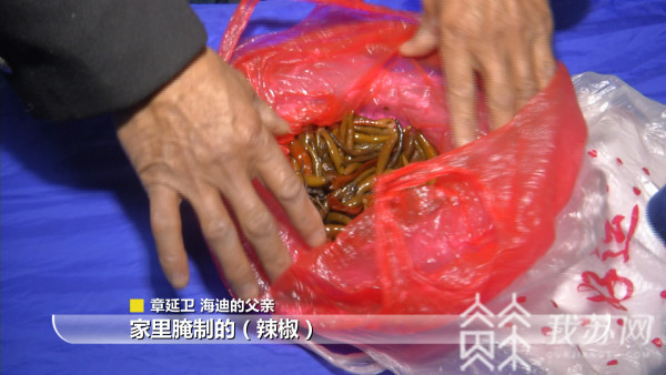 1月5号,记者在病房见到了海迪的父亲章延卫,他说:“ 这是家里腌制的辣椒,就着饼 ,然后喝点开水,这是我吃的。”