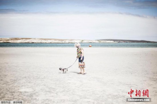 资料图:2020年12月29日,南非兰格班,一名老妇人在空旷海滩短暂地遛狗。