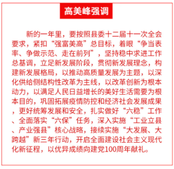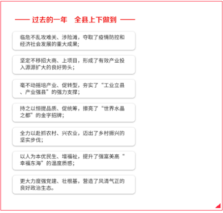 政协东海县第十届委员会第五次会议开幕,高美峰发表讲话、张其兵点评政协委员发言、何东明作政协常委会工作报告。 1月5日上午,中国人民政治协商会议东海县第十届委员会第五次会议在东海县委党校报告厅开幕。来自全县各条战线、各个界别的政协委员肩负着全县百万人民的重托共聚一堂,认真履行政治协商、民主监督、参政议政的职能,为奋力开启东海全面建设社会主义现代化新征程凝心聚力、建言献策。 东海县领导高美峰、张其兵、陈启发、何东明、尤永江、朱恒山、朱崇慧、刘晓君、徐冰、冯小宏、宋卫东、欧伟、孔繁清、张继生、李斌、张海斌、冒锋、李宝芹、章荣刚、薛剑、曹德松、张兴旺、李超、石贵舟、丁相玖、梁步显、王祥武、邢卫锋,东海县法院院长刘刚,东海县检察院代检察长霍介涛,原东海县领导张之勤、刘恒益、黄贵华在主席台就座。 应邀出席会议的还有历届东海县四套班子离退休老领导,县政协机关离任的老同志,县各部门、各单位、各乡镇、场(街道)的主要负责同志,驻东海的市政协委员。本次会议应出席委员276名,因事、因病请假 21名,实际到会委员255名,符合《政协章程》规定的人数。 东海县委书记高美峰在会上发表讲话 东海县委副书记、县长张其兵就政协委员发言进行点评 东海县政协副主席丁相玖代表政协东海县第十届委员会常务委员会作提案工作情况报告,东海县政协副主席梁步显主持开幕式,部分政协委员代表作大会发言。 高美峰代表中共东海县委向大会的召开表示热烈祝贺 。 他说,刚刚过去的2020年是东海发展历史上极不平凡的一年,新冠疫情突如其来,经济发展备受冲击,各种挑战前所未有。东海县委团结带领全县干群上下同心、迎难而上, 用汗水浇灌收获、以实干笃定前行 在大战大考中经受住了重大考验,取得了显著成绩。我们动真碰硬、敢于亮剑,切实加大压力传导,持续加快工作节奏,全面提振干部精气神,凝聚起“强作风、扬正气、争第一”的强大军心士气,打赢了一场又一场硬仗,取得了一个又一个胜利 。 今年是我国开启全面建设社会主义现代化国家新征程,向第二个百年奋斗目标进军的起步之年。东海县政协和广大政协委员要围绕东海县委十二届十一次全会对今年工作作出的部署,按照东海县委全会要求紧扣“强富美高”总目标,着眼“争当表率、争做示范、走在前列” ,坚持稳中求进工作总基调,聚焦新目标、落实新部署,进一步增强履行使命的政治自觉、思想自觉和行动自觉,真抓实干、奋发有为,为开启全面建设社会主义现代化新征程书写更多政协篇章。 要解放思想,提高政治站位,增强履职意识,密切联系群众,更加积极主动地为夺取开局首胜贡献智慧力量;要围绕中心,聚焦发展重点、改革难点、民生热点,更加科学精准地为夺取开局首胜贡献智慧力量;要优化作风,强化组织保障,严守纪律规矩,勇于担当作为,更加求真务实地为夺取开局首胜贡献智慧力量。 何东明在报告中说,2020年是高水平全面建成小康社会的决胜之年,也是新时代人民政协事业全面提质增效的一年。 一年来,东海县政协常委会在中共东海县委的坚强领导下坚持以习近平新时代中国特色社会主义思想为统领,准确把握专门协商机构新定位,强化落实“双向发力”新要求,认真履行政治协商、民主监督、参政议政三大职能 ,各项工作都取得了新的成绩,为全县经济社会发展作出了积极贡献。 东海县政协常委会不断加强党的创新理论武装,旗帜鲜明讲政治、系统学习强素质、凝心聚力增共识,筑牢共同思想政治基础,确保政协事业方向坚定、行稳致远;发挥专门协商机构作用,围绕县委“八个决战决胜”,助力谋划“十四五”发展蓝图、竭力助推经济发展转型、倾力服务全县重点工作、聚力攻坚生态文明建设,为党政科学决策、有效施策提供智力支持;聚焦人民美好生活期盼,紧盯事关民生发展的“头等大事”和涉及群众利益的“关键小事”,主动投身疫情防控、务实建言民生保障、真情回应群众关切,协助党委政府破解民生难题,补齐民生短板,助推群众幸福指数提升;坚持高起点谋划、高标准建设、高质量运行,在全市率先打造“有事好商量”协商议事平台。 一年来,401家“有事好商量”协商议事室共开展协商议事活动1624场,形成并转办建议清单2023份,已办理落实清单1846件,有效地激发了基层治理新效能;坚持把牢监督定位、把准监督尺度、把握监督实效,持续深化民主监督实践,三级联动守牢安全生产防线、跟踪督办力促提案落地有声、驻点一线助力部门改进工作,助力全县重大改革举措落地见效、重要政策法规贯彻执行、重点项目推进实施;主动适应新形势、新任务的要求,与时俱进强化自身建设,履职指导强化委员管理、制度建设强化规范运行、能力提升强化服务保障,创新机制激发内生动力,不断提升政协工作的科学化、规范化和制度化水平。 2021年是中国共产党成立100周年,是“十四五”规划的开局之年,也是人民政协站在新的历史起点上全面履职的奋进之年。 2021年工作重点 坚持党对政协工作的全面领导 把理论武装摆在更加突出位置、把党的领导贯穿政协履职全过程、把党建组织网络不断向基层延伸; 聚焦党政中心任务履职尽责 持续聚焦经济发展高质量、助力融入国际国内“双循环”、全力助推城市
