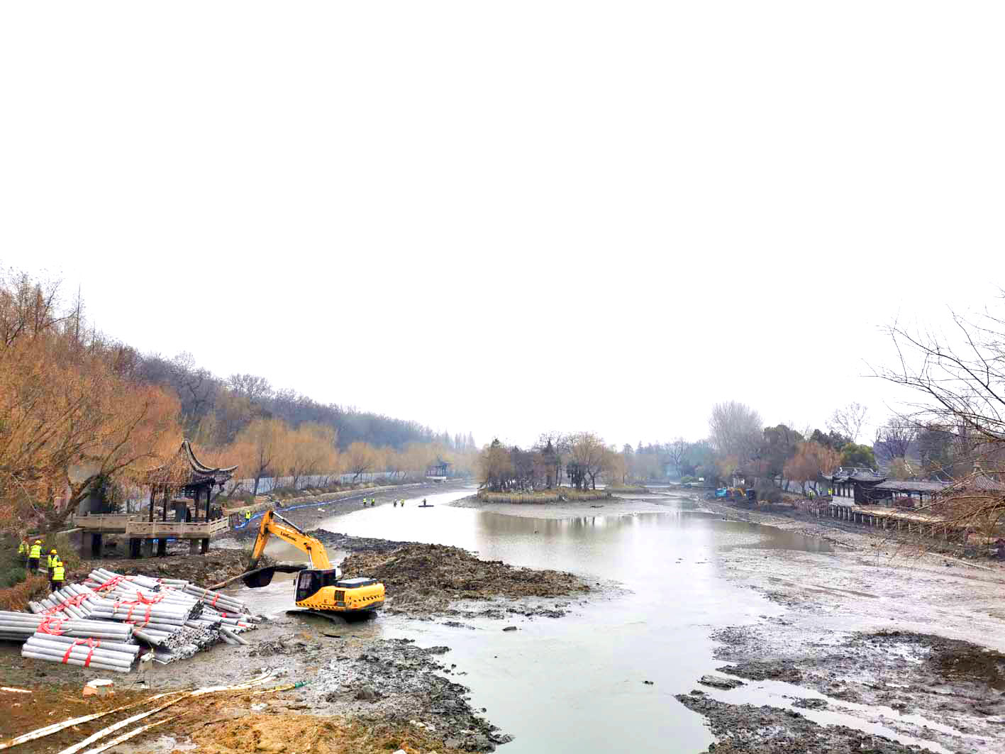 记者在瘦西湖景区南门看到,工程人员正在紧张施工,该标段的湖水已排空一半,湖底淤泥大面积裸露。