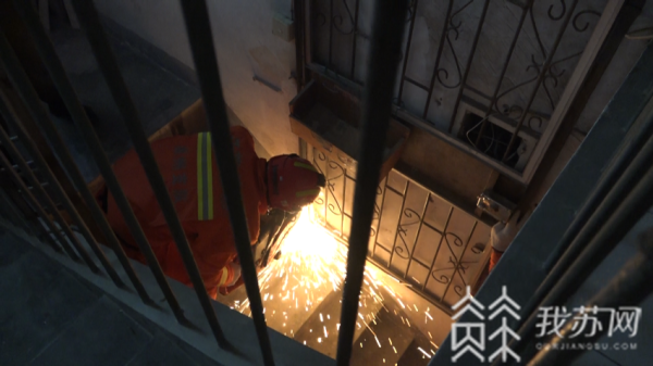 在一幢居民楼的6楼半,执法人员发现有顶层居民私自在楼梯道内安装了一个防盗门,消防人员立即进行破拆。