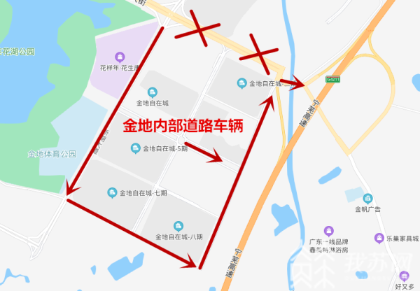 封闭后,区域分流通道分别为:新湖大道—湖景路—板东路—大方互通;金地自在城内部出行通道:新湖大道—莲花湖东街—板东路—大方互通。