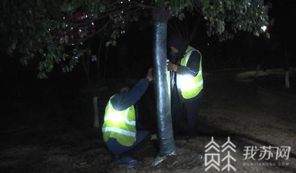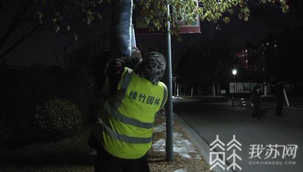 为此,住建部门提早组织人员,对公园广场、主要道路两侧高大树木缠绕绿色加绒无纺布、草绳等,对植物实施防寒处理。由于工作量较大,园林工人不得不连夜开展作业。