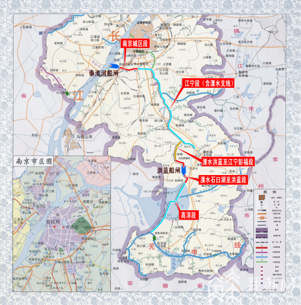 一期工程改线段起自毛家村南侧向西北新开航道,从施家庄东侧接入石湫新河,再沿石湫新河北上,在江宁王家圩接入原秦淮河航道。“一期工程整治的主要原因就是为了避开天生桥景区。改道之后,秦淮河与下游的石臼湖水位落差非常大,因此,现在已经建成的洪蓝船闸就起到了一个调节阀的作用。”秦淮河航道整治工程现场指挥部工程部主任贺其诚所说的洪蓝船闸目前已经建成,当船舶从秦淮河到达该船闸,通过上下游的船闸的关闭开合,水面落差“抹平”后,船只就可以顺利进入石臼湖。