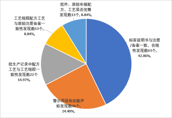 检查发现不一致项目数共计147个,其中标签说明书与注册/备案合规性发现不一致项目数63个,占比42.86%;警示用语和功能声称不一致性项目数发现36个,占比24.49%;批生产记录中配方工艺与工艺规程不一致项目数发现22个,占比14.97%;批件、原始申报配合、工艺完整方面发现不一致项目数13个,占比8.84%;工艺规程配方工艺与原始注册备案不一致项目数为13个,占比8.84%。