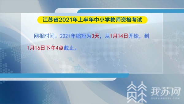 《公告》明确,江苏省2021年上半年中小学教师资格考试笔试将于3月13日举行。报名条件、审核要求、网上缴费方式、准考证打印时间、考试疫情防控要求、成绩查询时间及方式等,与去年相比几无变化。