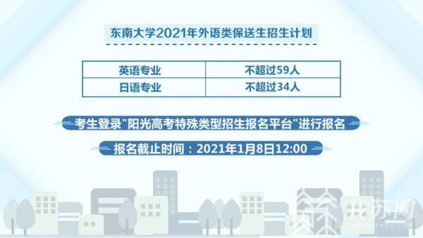 2021年元旦前后,在江苏,南京大学、东南大学等6所部属院校陆续发布2021年特殊类型招生简章,主要涉及外语类保送生、高水平艺术团、高水平运动队的招生计划、报考要求、选拔程序等。