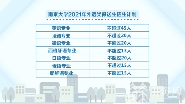 2021年招收外语类保送生的还有江南大学。该校要求报考者所在中学为教育部批准的、具有推荐保送生资格的16所外国语中学之一。招生专业为英语、日语,招生不超过10人,择优录取。此外,该校高水平运动队的招生项目为乒乓球,招生计划不超过20人。
