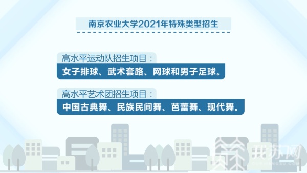 南京农业大学高水平运动队2021年招生项目包括女子排球、武术套路、网球和男子足球。高水平艺术团招生计划为不超过3人,招生项目包括中国古典舞、民族民间舞、芭蕾舞、现代舞。表演专业计划招40人,其中江苏招16人。