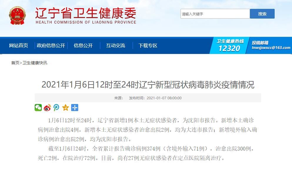 荔枝新闻讯 据辽宁卫健委官网消息,1月6日12时至24时,辽宁省新增1例本土无症状感染者,为沈阳市报告。新增本土确诊病例治愈出院4例,新增本土无症状感染者治愈出院2例,均为大连市报告;新增境外输入确诊病例治愈出院2例,均为沈阳市报告。