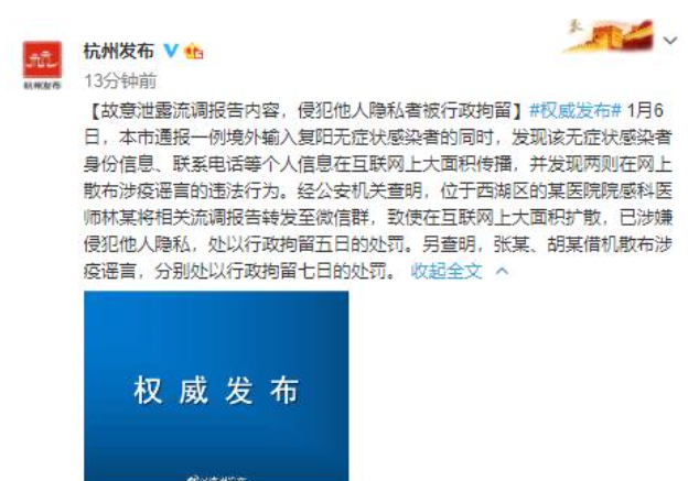 荔枝新闻讯 据杭州发布微博消息,1月6日,杭州市通报一例境外输入复阳无症状感染者的同时,发现该无症状感染者身份信息、联系电话等个人信息在互联网上大面积传播,并发现两则在网上散布涉疫谣言的违法行为。经公安机关查明,位于西湖区的某医院院感科医师林某将相关流调报告转发至微信群,致使在互联网上大面积扩散,已涉嫌侵犯他人隐私,处以行政拘留五日的处罚。另查明,张某、胡某借机散布涉疫谣言,分别处以行政拘留七日的处罚。
