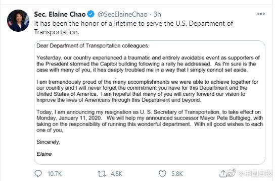 7日下午1时许,美国交通部长赵小兰发推宣布辞职,是首个在国会骚乱事件后辞职的部长级官员。