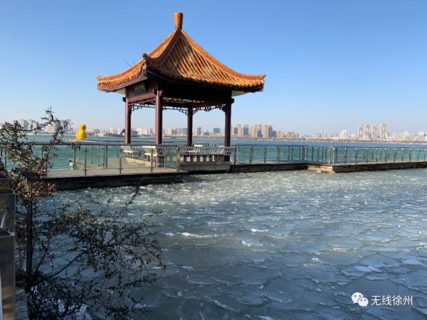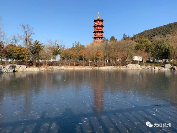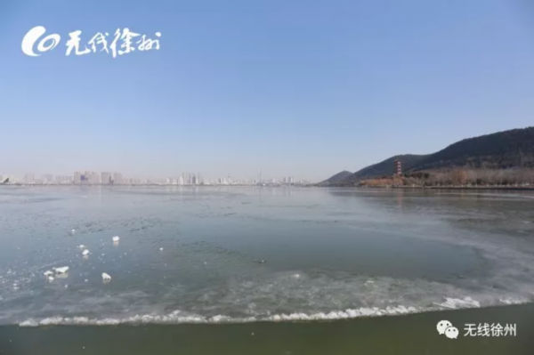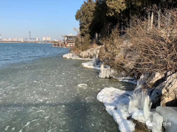 一夜寒风过,云龙湖沿岸大片水域结冰,一片蔚蓝之上,苏公塔边上演“冰雪奇缘”。