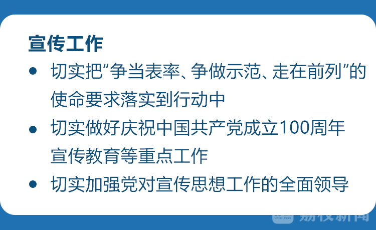 会议指出,宣传工作要坚持把学习宣传习近平新时代中国特色社会主义思想、学习宣传习近平总书记视察江苏重要讲话指示精神作为长期的重大政治任务,引导干部群众系统理解把握、全面贯彻落实,切实把“争当表率、争做示范、走在前列”的使命要求落实到行动中。要按照全国宣传部长会议部署,抓紧谋划我省宣传工作安排,切实做好庆祝中国共产党成立100周年宣传教育等重点工作,更加有效凝聚奋斗“十四五”、奋进新征程的强大精神力量。各级党委(党组)要切实加强党对宣传思想工作的全面领导,认真贯彻落实《宣传工作条例》,为做好宣传思想工作提供坚强保障。
