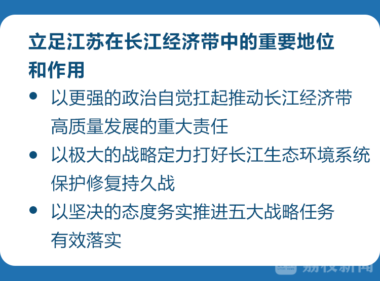 会议强调,要立足江苏在长江经济带中的重要地位和作用,以更强的政治自觉扛起推动长江经济带高质量发展的重大责任,切实在“共抓大保护、不搞大开发”上走在前列;以极大的战略定力打好长江生态环境系统保护修复持久战,推进长江生态环境加快好转、根本好转;以坚决的态度务实推进五大战略任务有效落实,抓谋划要实,干工作要实,见成效要实,在推动长江经济带高质量发展上创造更多过硬成果。