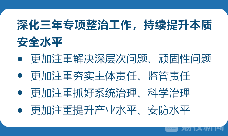 会议讨论了《关于进一步深化安全生产三年专项整治工作的意见》《2021年设区市党委政府和省安委会成员单位履行安全生产工作责任考核评价指标》。会议指出,深化三年专项整治工作,要紧紧围绕“务必整出成效”和“两个不放松”,持续提升本质安全水平。要更加注重解决深层次问题、顽固性问题,把难度较大、治而复发的突出问题作为重点,着力在源头上堵住漏洞,在制度上打好补丁,在推进上久久为功。要更加注重夯实主体责任、监管责任,推动企业严格落实主体责任20条重点事项,坚持领导责任不变、工作专班不撤、督导机制不改,推动各地各部门刚性落实监管职责。要更加注重抓好系统治理、科学治理,将解决当前问题与建立长效机制统筹考虑,加强规律性把握,探索“从根本上消除事故隐患”的路径。要更加注重提升产业水平、安防水平,深入推进“砸笼换绿”“腾笼换鸟”“开笼引凤”,着力推动技防现代化,努力在安全生产上走在前列。