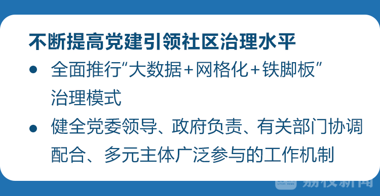 会议讨论了《关于加强新型农村社区治理和服务的意见》,强调要以提升基层党组织政治功能和组织力为重点,不断提高党建引领社区治理水平。全面推行“大数据+网格化+铁脚板”治理模式,加快推动自治、法治、德治相融合。健全党委领导、政府负责、有关部门协调配合、多元主体广泛参与的工作机制,努力建设既充满活力又和谐有序的新型农村社区。