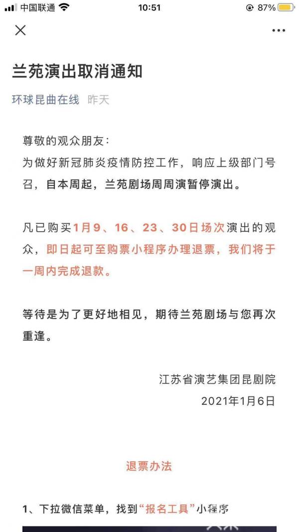 江苏省昆剧院官方微信“环球昆曲在线”发布公告:自本周起,兰苑剧场周周演暂停演出。凡已购买1月9、16、23、30日场次演出的观众,即日起可至购票小程序办理退票,并将于1周内收到退款。省演艺集团苏演票务公司官微“江苏演艺”发布公告:原定于2021年1月8-9日于紫金大戏院上演的经典绘本剧《好饿的毛毛虫秀》南京站演出确认延期。