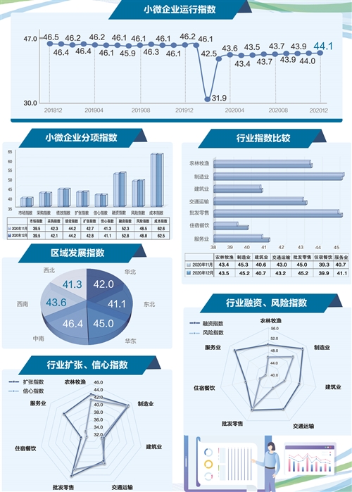 2020年12月份,“经济日报—中国邮政储蓄银行小微企业运行指数”为44.1,较上月上升0.1个点。