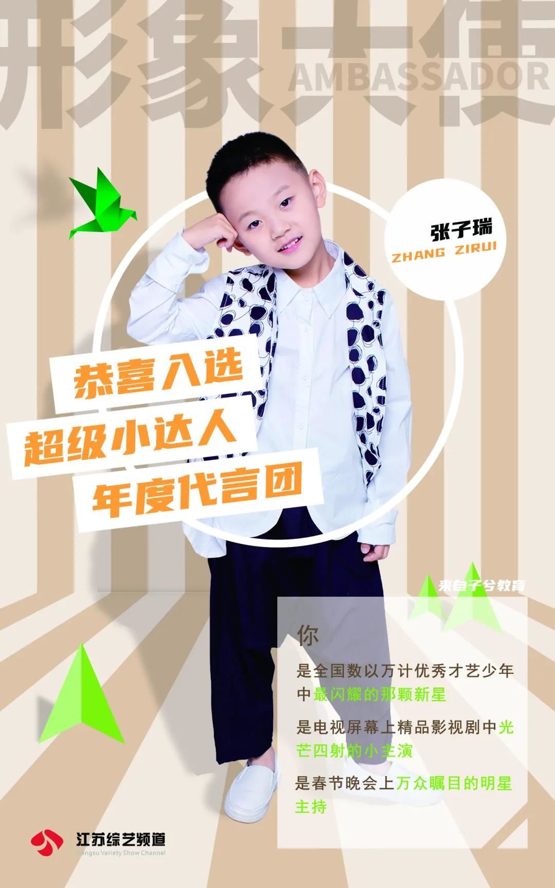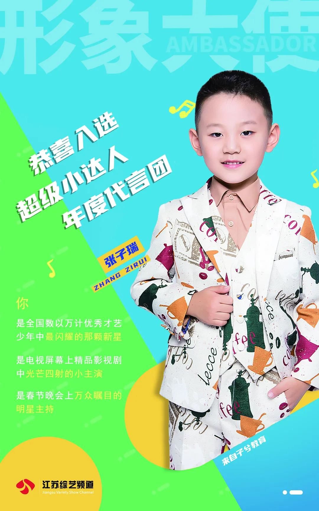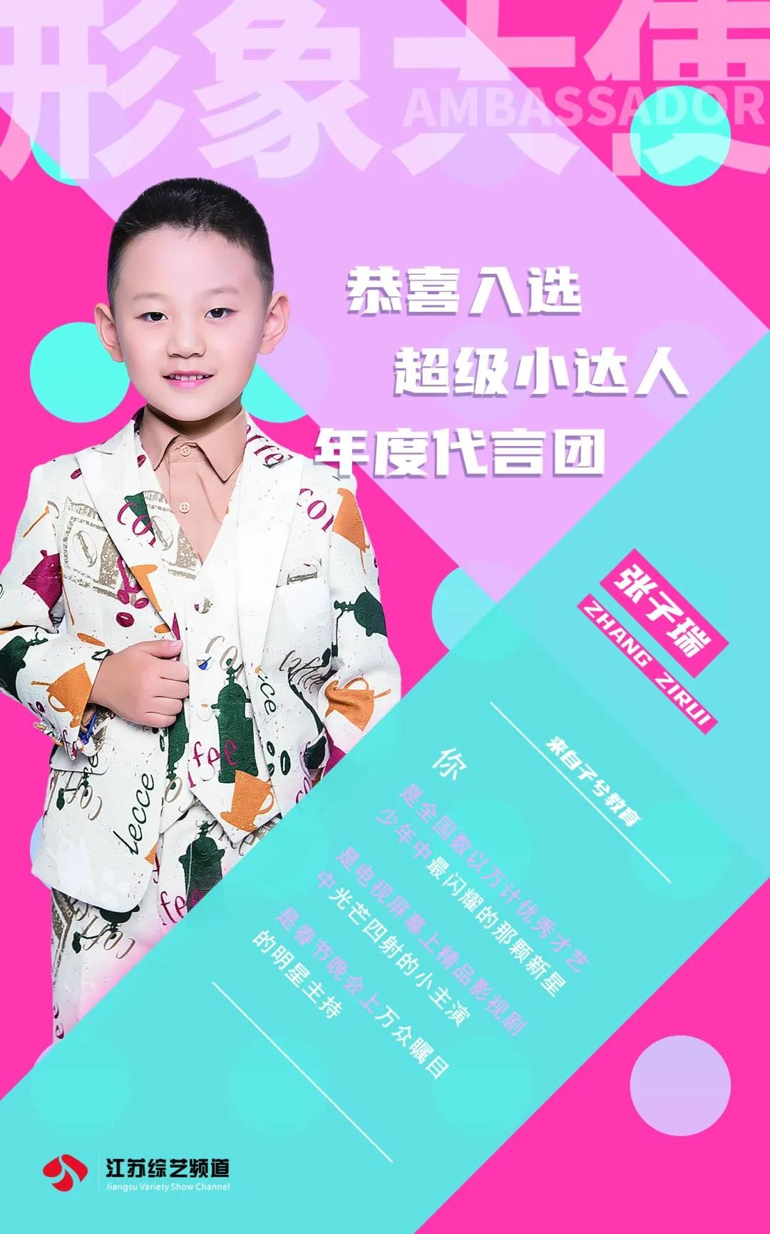 恭喜张子瑞入选超级小达人城市形象大使作为2021年城市形象大使出席小达人相关活动,与江苏电视台著名主持人同台主持江苏综艺少儿春晚,并在接下来的江苏影视频道定制微电影中担任主角,同时会在春晚的电视荧屏上给全省的观众送上新年的祝福。
