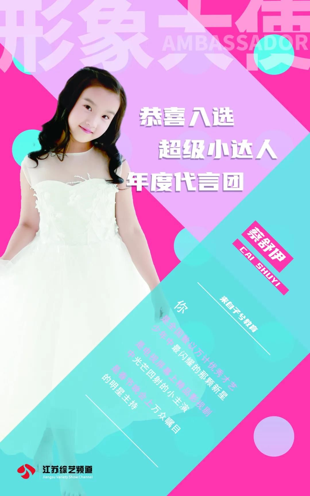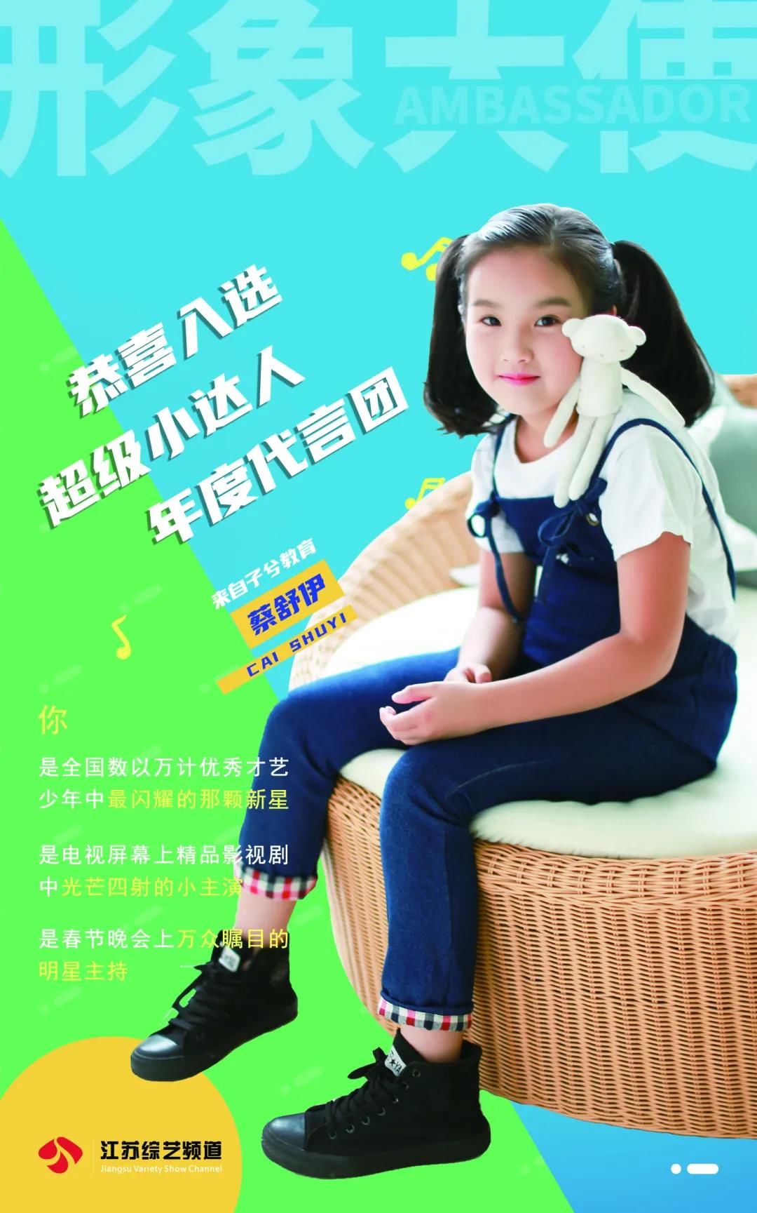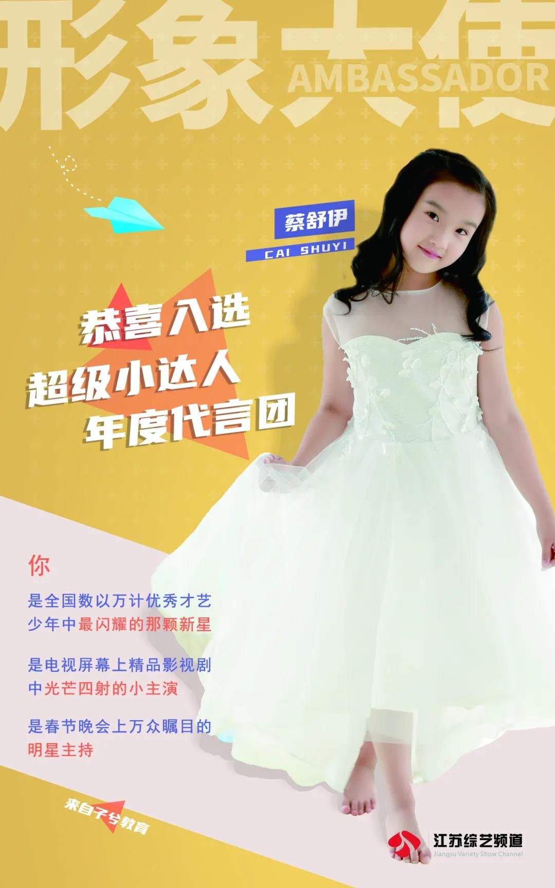 恭喜蔡舒伊入选超级小达人城市形象大使作为2021年城市形象大使出席小达人相关活动,与江苏电视台著名主持人同台主持江苏综艺少儿春晚,并在接下来的江苏影视频道定制微电影中担任主角,同时会在春晚的电视荧屏上给全省的观众送上新年的祝福。