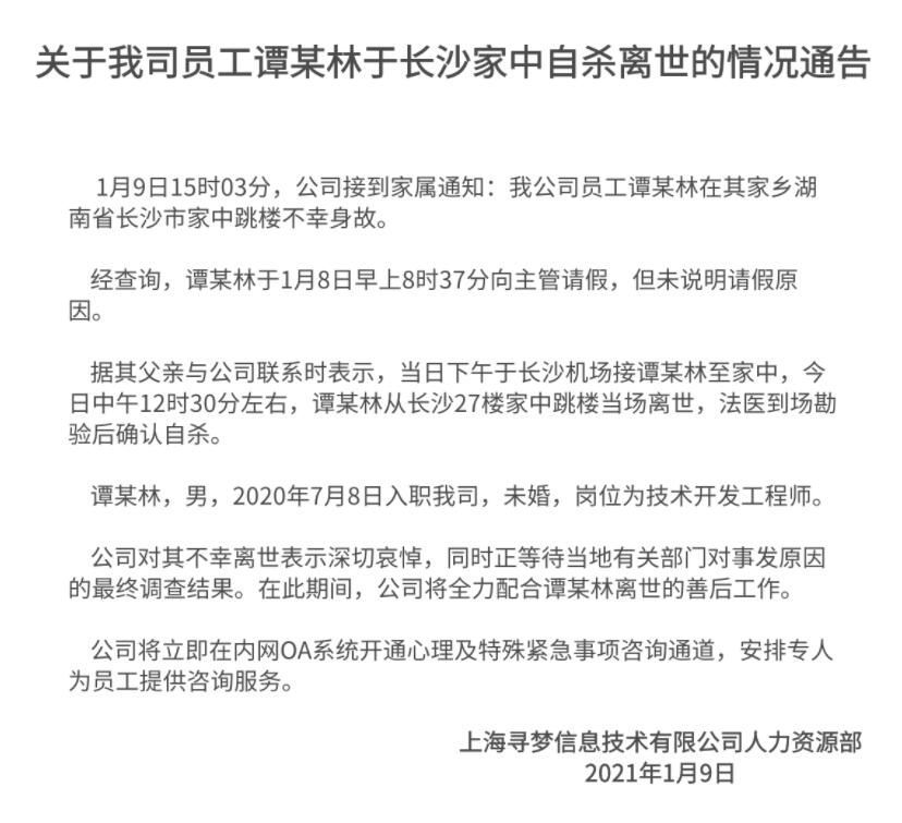 关于我司员工谭某林于长沙家中自杀离世的情况通告