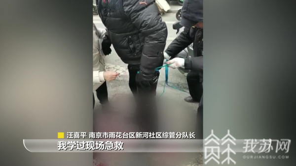 南京市雨花台区新河社区综管分队长汪喜平说:“拍视频、照片,我们要取证。我到一边的商店找绳子、找绷带,店家提供一个绷带给我,我学过现场急救,当时我就把伤者伤处绑了三道,绑过以后把血止住了。”
