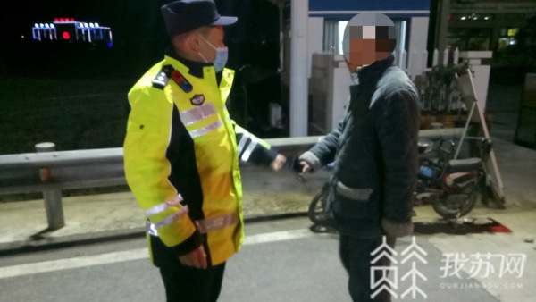 1月7日晚上22时许,宿迁交警高速三大队民警郑荣青带领同事巡逻至双沟收费站口时,发现一名男子骑着二轮电动自行车摇摇晃晃地往双沟收费站入口驶入。见此危险情形,民警急忙靠边停车,并迅速将骑车男子和电动自行车转移至安全地带。