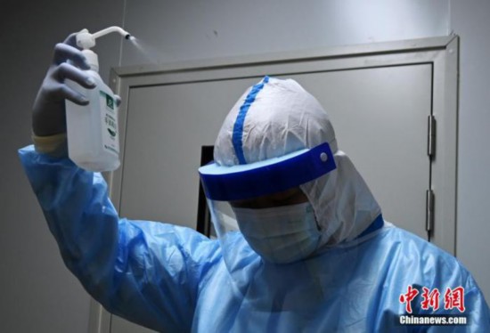 1月8日,石家庄市全员检测核酸第三天。在河北医科大学第一医院检验中心,距离“病毒”最近的医护工作者们正在认真的工作。据该医院检验中心主任张征介绍,为确保核酸检测额准确高效,该中心的医护人员实行24小时轮换上岗,目前日均核酸检测2万至3万人次。7日0—24时,石家庄新增31本地新冠肺炎确诊病例,新增35例无症状感染者。图为“90后”张鑫全副武装准备接班。 中新社记者 翟羽佳 摄