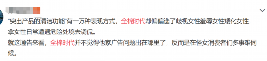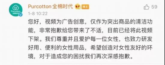 针对网友热议的“全棉时代广告涉嫌侮辱女性”一事,1月8日,全棉时代官方微博回应: