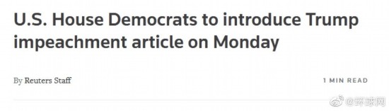 路透社刚刚消息,美国众议院议员刘云平当地时间9日表示,众议院民主党人计划在周一(1月11日)推出弹劾特朗普总统的立法条款。