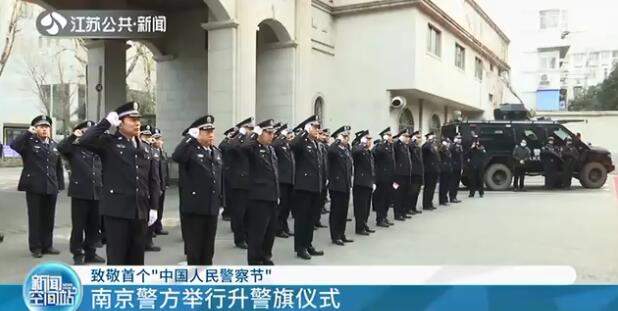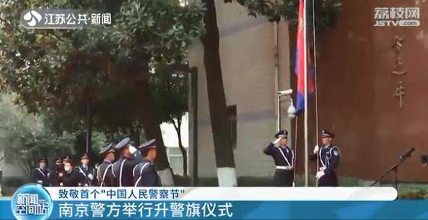 在南京市公安局,上午8点20分,举行第一个中国人民警察节的升警旗仪式。承载着荣誉、责任和使命的中国人民警察警旗,在现场民警的注目下,冉冉升起。
