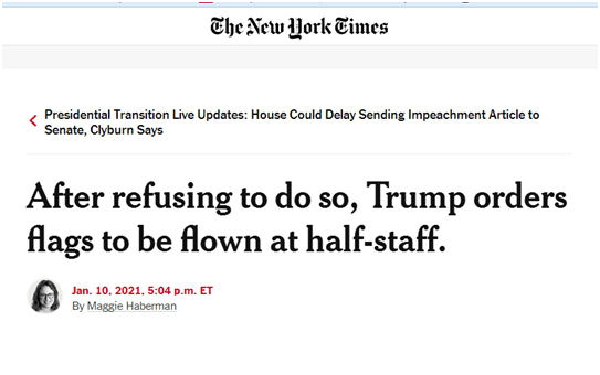 【环球网快讯】据美国《纽约时报》最新报道,美国现任总统特朗普当地时间10日下令,要求全美于1月13日降半旗,以悼念在国会骚乱中丧生的两名美国警察。