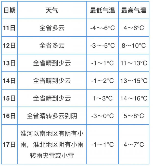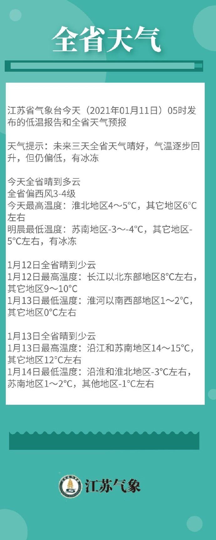 今天(1月11日)江苏全省晴到多云,全省偏西风3-4级,今天最高温度:淮北地区4~5℃,其它地区6℃左右,明晨最低温度:苏南地区-3~-4℃,其它地区-5℃左右,有冰冻。