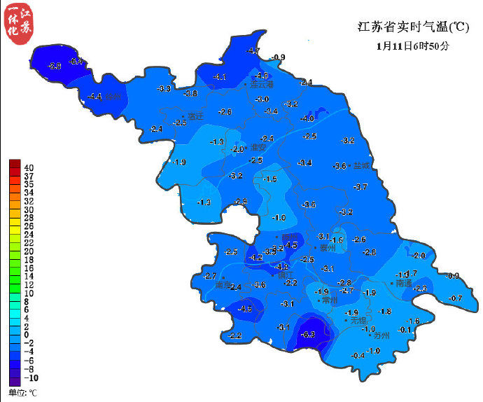 目前,江苏大部分地区温度都在-4℃到-1℃左右,局部地区只有-6℃。温度较低,出门一定要注意防寒保暖。