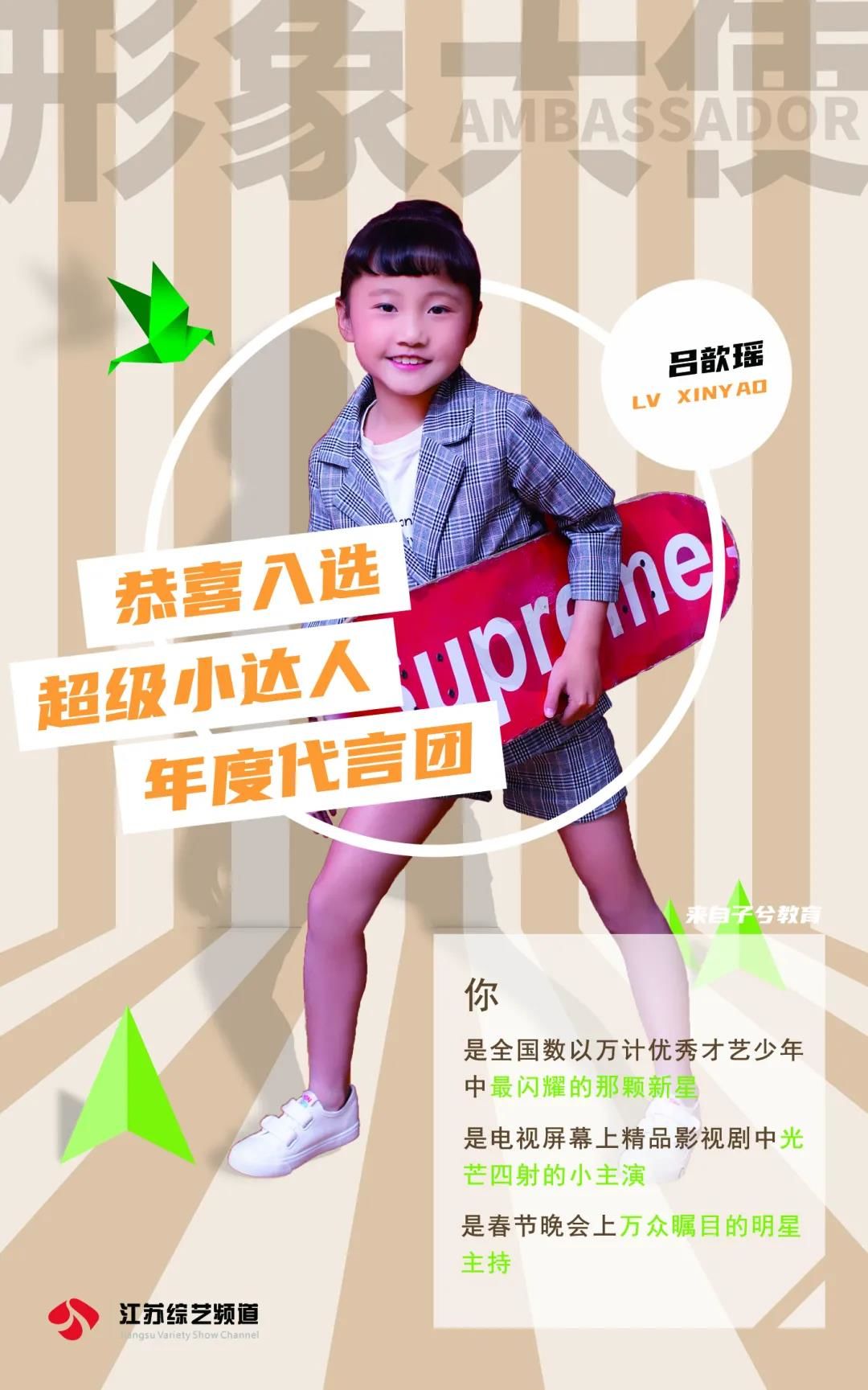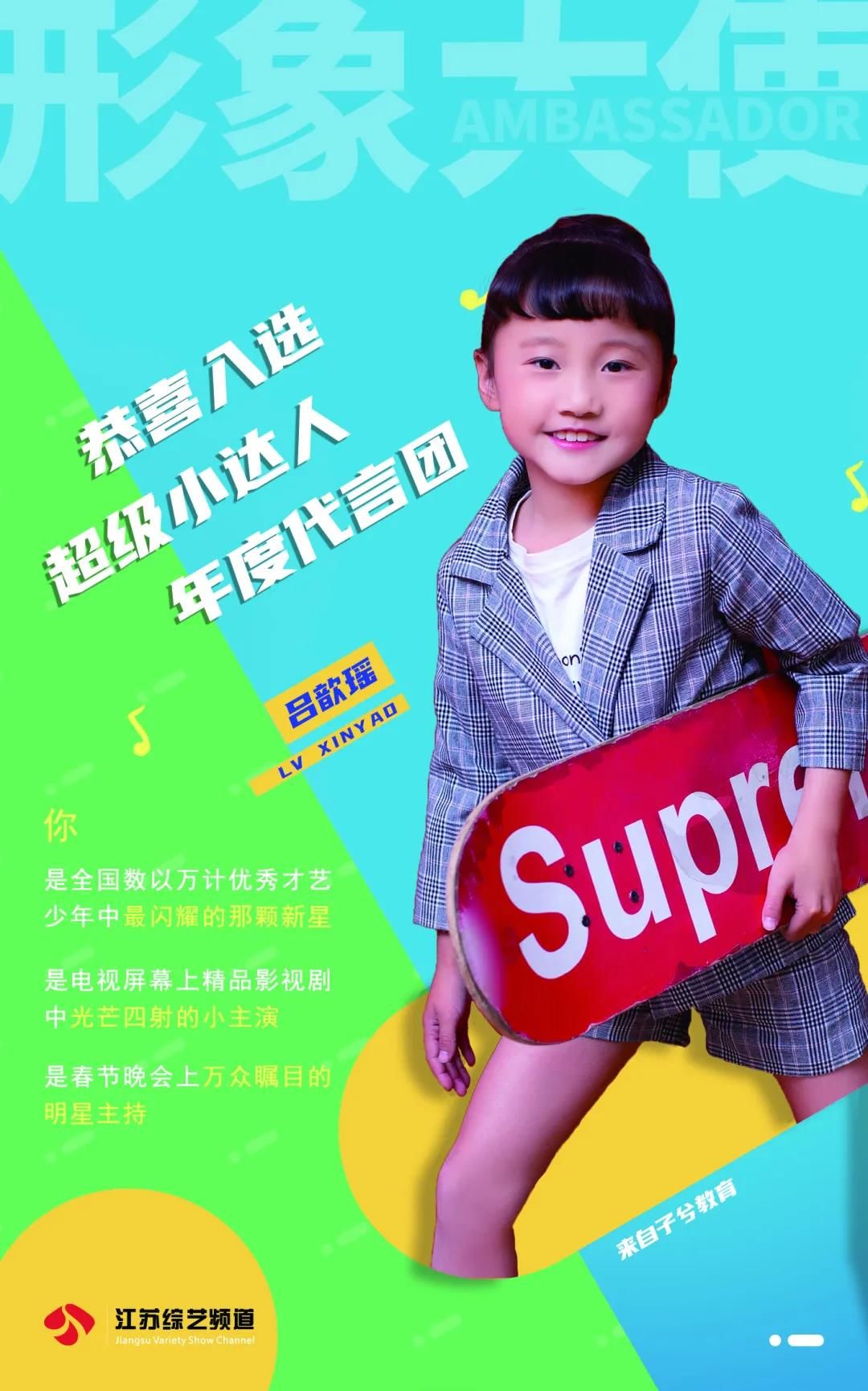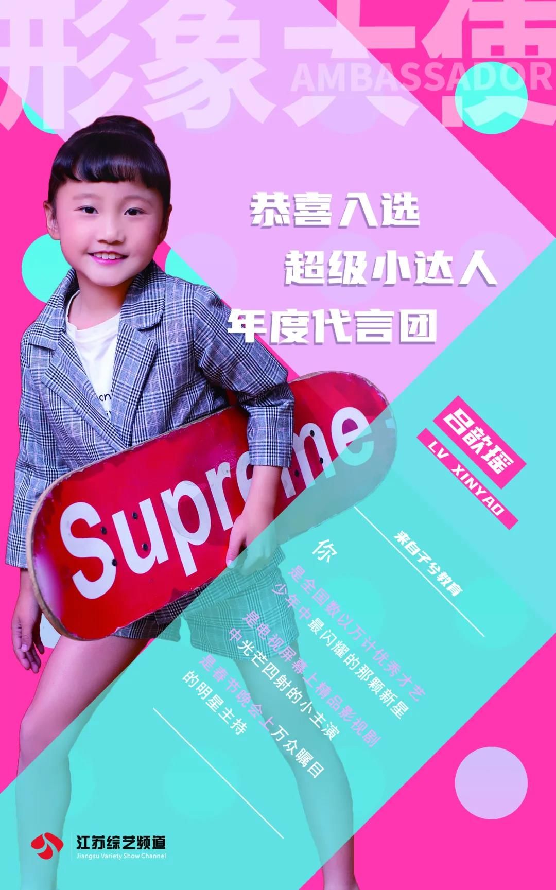 恭喜吕歆瑶入选超级小达人城市形象大使作为2021年城市形象大使出席小达人相关活动,与江苏电视台著名主持人同台主持江苏综艺少儿春晚,并在接下来的江苏影视频道定制微电影中担任主角,同时会在春晚的电视荧屏上给全省的观众送上新年的祝福。