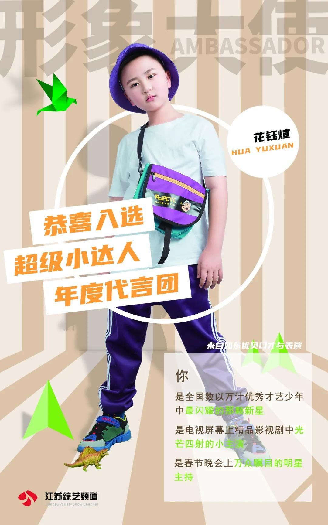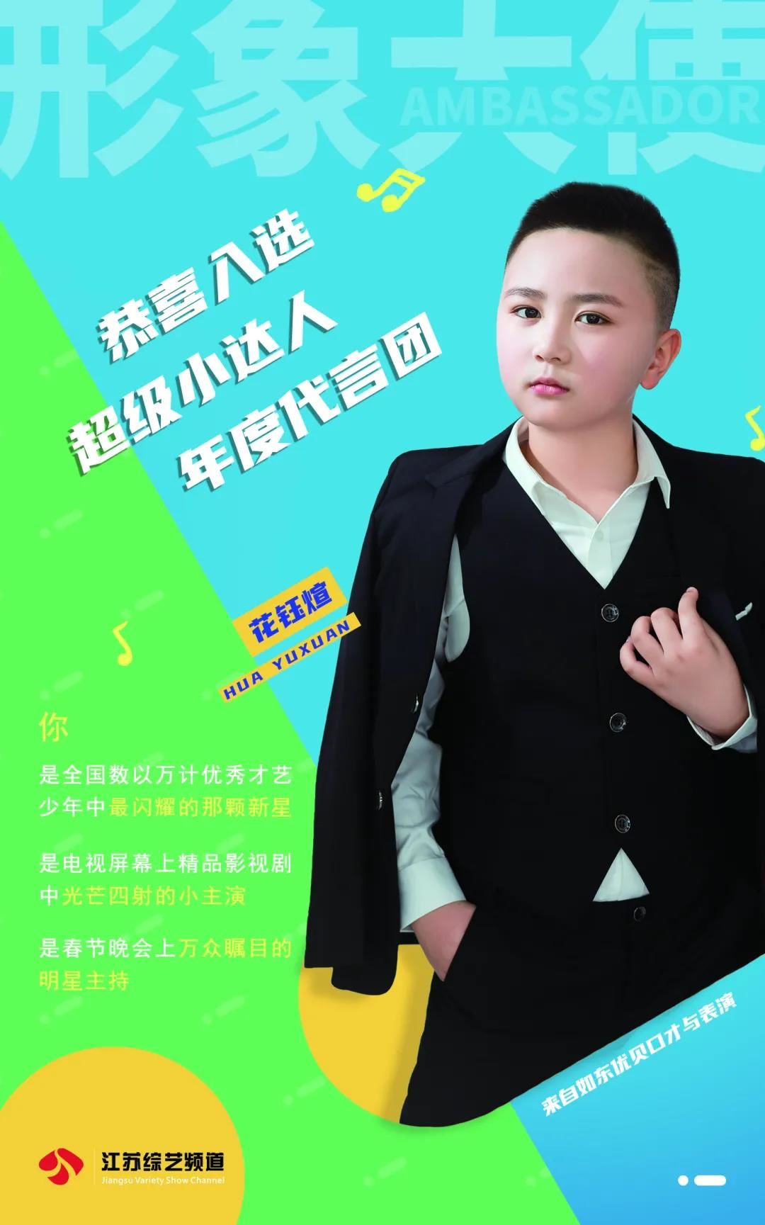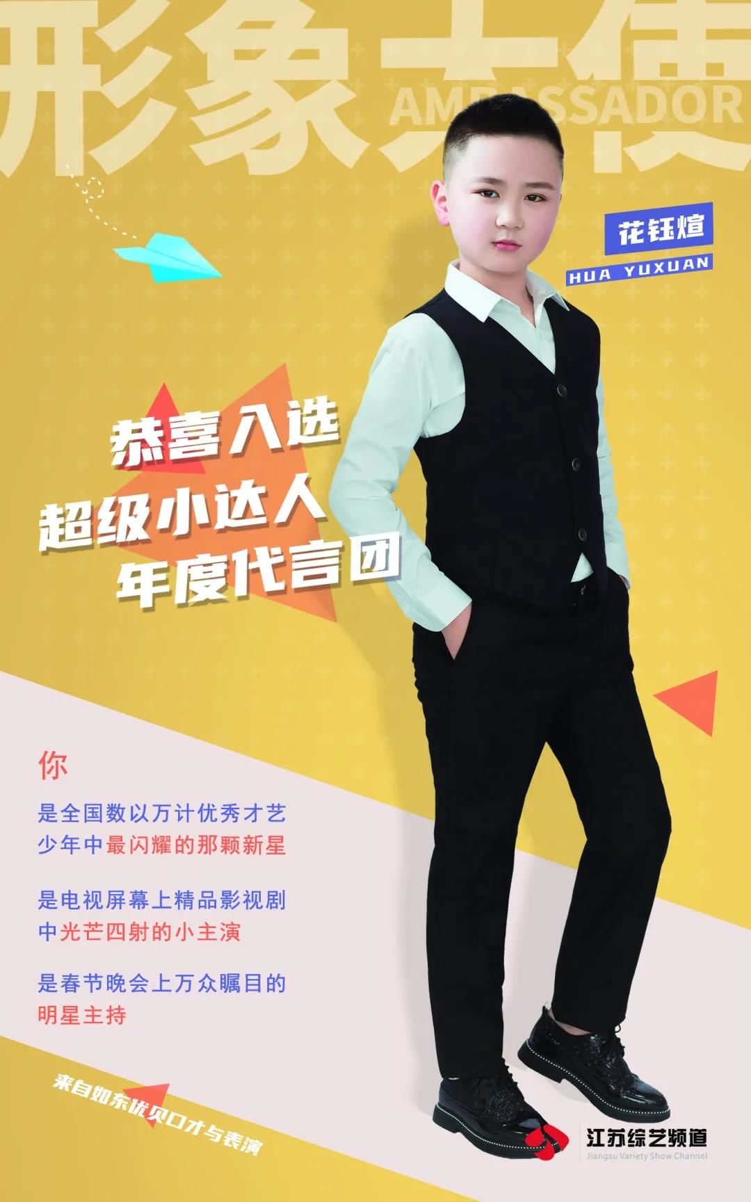 恭喜花钰煊入选超级小达人城市形象大使作为2021年城市形象大使出席小达人相关活动,与江苏电视台著名主持人同台主持江苏综艺少儿春晚,并在接下来的江苏影视频道定制微电影中担任主角,同时会在春晚的电视荧屏上给全省的观众送上新年的祝福。