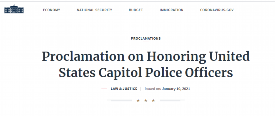在一份于当地时间1月10日发布在美国白宫官网上的公告中,美国总统特朗普表示为了悼念“牺牲”的美国国会警察布莱恩·西柯尼可(Brian D. Sicknick)和霍华德·利本古德(Howard Liebengood),并向美国国会警察以及全美国所有的执法机关致以“敬意”,他已经下令让包括美国白宫在内的美国各政府机构、军队和使领馆等驻外机构降半旗3天。