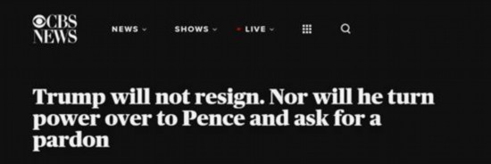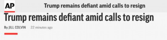 特朗普政府三名知情人士当地时间10日告诉美国哥伦比亚广播公司(CBS)说,特朗普没有辞职计划,也并没有感到任何要求他辞职的压力。美联社也称,特朗普表示没有辞职的打算。