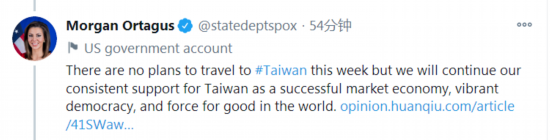 接着,她还继续写道,“(即使蓬佩奥)这周没有访问台湾的计划,但是我们将继续坚定不移地支持台湾作为一个成功的市场经济体、充斥着活力的民主社会以及为世界带来美好的力量。”推文后,她还附上了环球网发布的这篇社评链接。↓