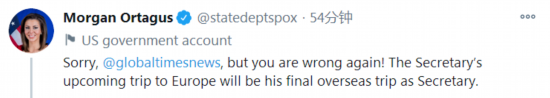 奥尔塔格斯先是“澄清”写道:“国务卿即将对欧洲进行的访问,将是他作为国务卿的最后一次海外出访行程。”↓