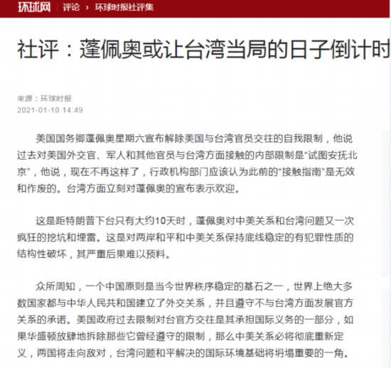 针对蓬佩奥的“丧心病狂”之举,环球时报10日刊发社评警告说,如果美方胆敢让蓬佩奥在任期结束前夕访台上演,北京的反应将是排山倒海式的。届时解放军战机将在第一时间飞临台湾上空,以前所未有的方式宣示中国对台湾岛的主权。如果台美方面胆敢做出过激反应,就很可能触发战争,我们将给配合蓬佩奥表演最后疯狂的台当局以根本性的惩罚。我们要正告台湾当局,如果他们跟着丧心病狂,美国现政府的最后几天也有可能是台湾民进党政权存在的最后几天。