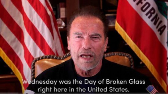在奥地利长大的施瓦辛格称,“周三(1月6日)就是美国版的‘水晶之夜’。破碎的玻璃是美国国会窗户上的。但是,暴徒们不仅仅是砸碎了国会大厦的窗户,更是打碎了我们认为理所应当的理念。被践踏的不仅是国会大厦的房门,更是美国赖以建立的原则。”