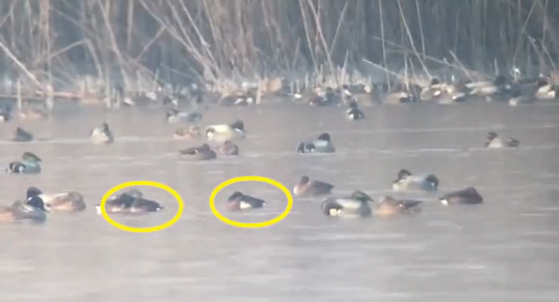 苏州湿地自然学校鸟类调查员周敏军在当天上午8点左右,拍摄了一段在昆承湖水面休息的野鸭子的视频。周敏军告诉记者,当时他在岸边用望远镜观察,看到1公里之外的湖面上有一群野鸭子,大约5000只,大致分属10多个种群。而当他回看用长焦镜头拍摄的视频和图片后,有了惊喜的发现。“我发现有两只潜鸭跟其他鸭子长得不太一样,仔细观察发现它的胁部是有白色的条纹,它的头是一种青绿色的,胸前是有棕色的斑块,由此来判断它是两只青头潜鸭。”周敏军说。