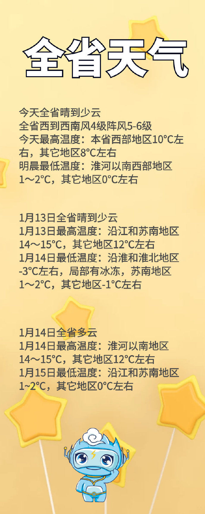 江苏省气象台首席预报员蒋义芳预计,从13日到15日这个时段,全省的气温不管从最低到最高都是在零度以上。15日的时候,全省的最高气温,沿江苏南地区能达到15℃到16℃、淮北地区也是在10℃到11℃左右。全省大部分天气都是晴好的,处于西南风里面,而且西南风比较大,这样有助于回温。