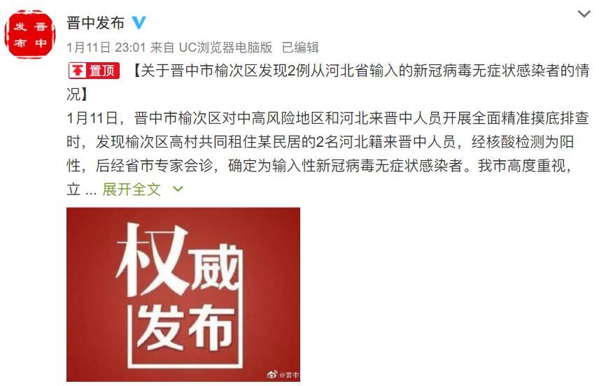 荔枝新闻讯 据山西省晋中市委新闻中心官方微博“晋中发布”消息,1月11日,晋中市榆次区对中高风险地区和河北来晋中人员开展全面精准摸底排查时,发现榆次区高村共同租住某民居的2名河北籍来晋中人员,经核酸检测为阳性,后经省市专家会诊,确定为输入性新冠病毒无症状感染者。晋中市高度重视,立即启动应急措施,第一时间召开全市疫情防控工作紧急会议,安排部署科学精准开展排查、管控等各项工作。