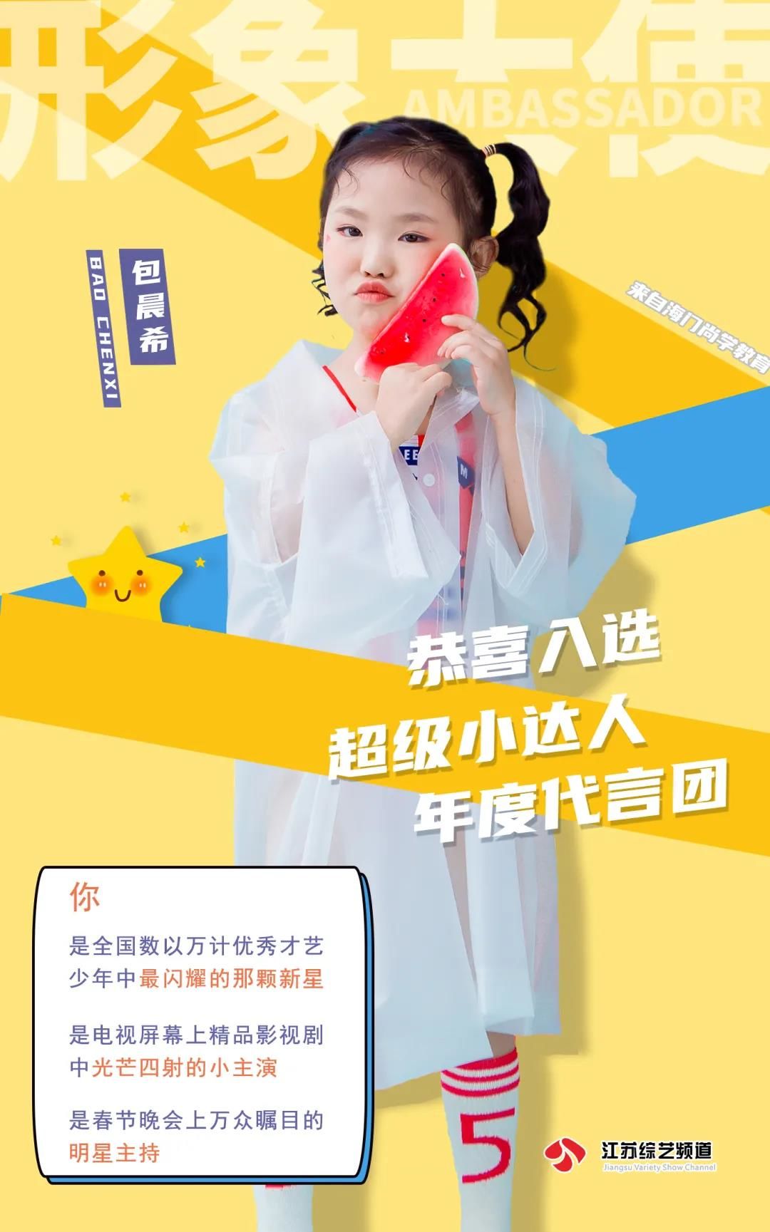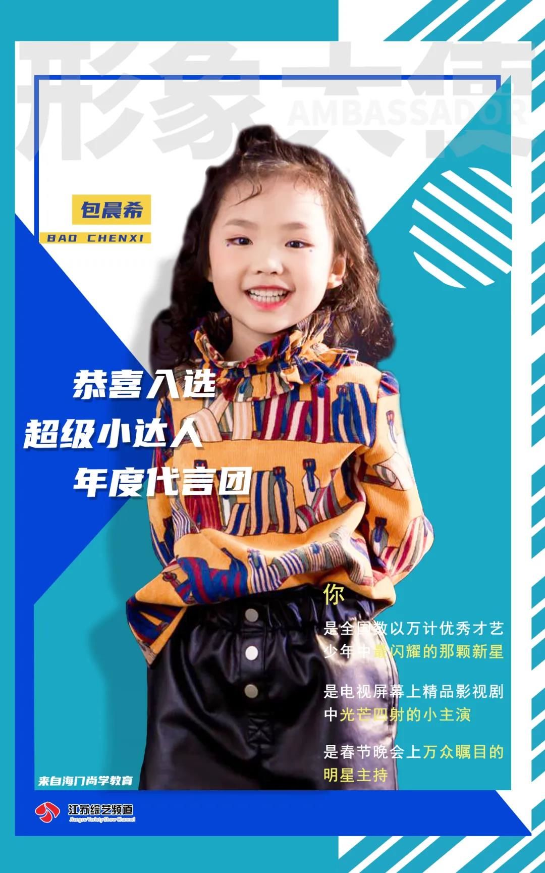 恭喜包晨希花入选超级小达人形象大使作为2021年形象大使出席小达人相关活动,与江苏电视台著名主持人同台主持江苏综艺少儿春晚,并在接下来的江苏影视频道定制微电影中担任主角,同时会在春晚的电视荧屏上给全省的观众送上新年的祝福。