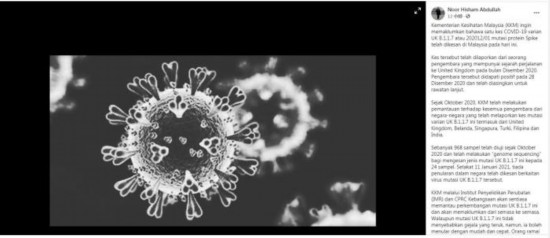 马来西亚卫生部总监努尔·希沙姆个人社交媒体账户截图。